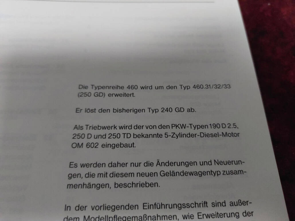 Die Abweichungen von dem bis dahin am Markt befindlichen 240GD und die damit verbundenen Neuerungen für den 250GD werden in diesem Buch näher beschrieben.